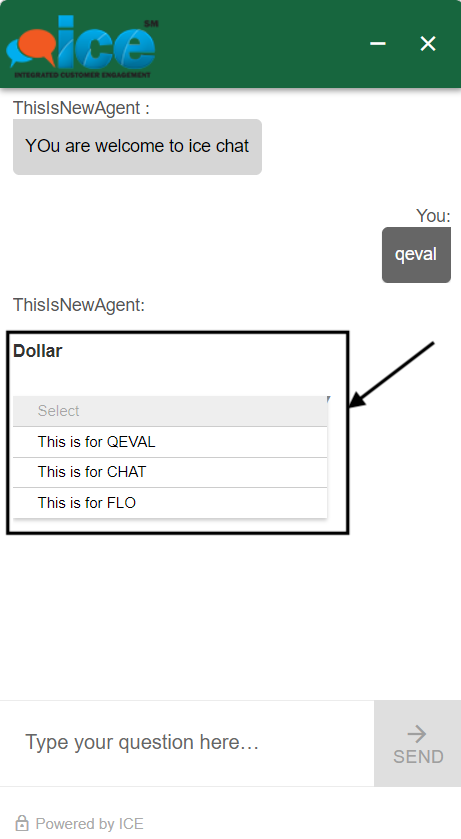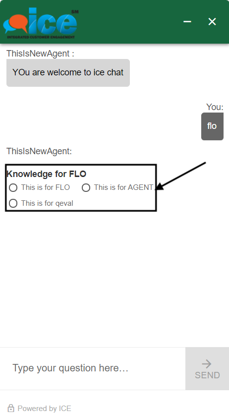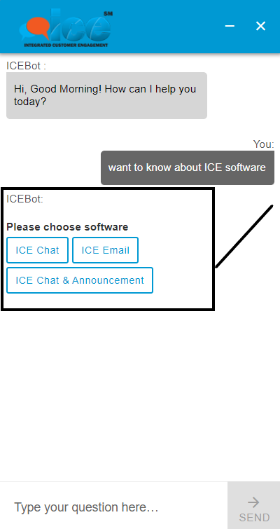 The visitor needs to select any of the options as highlighted below and communicate with the chatbot. The bot responses with button, dropdown, and radio button will be displayed on the visitor screen in the following format: