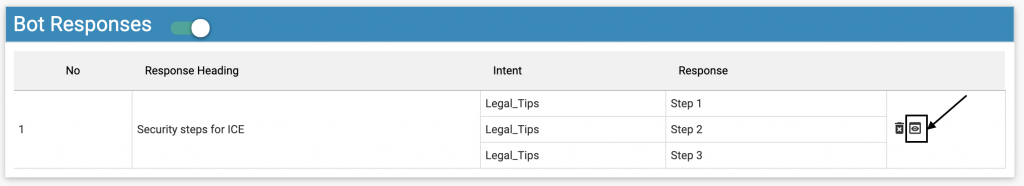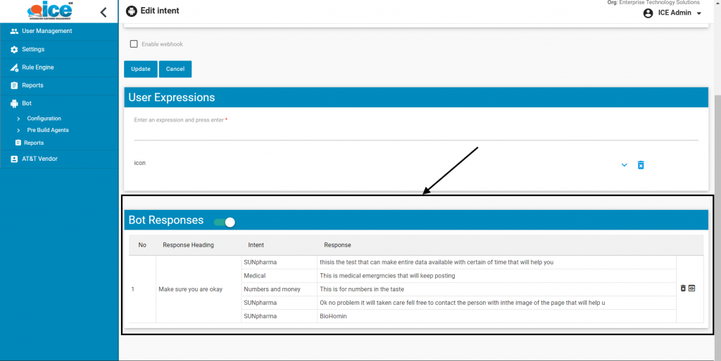 Once submitted, the responses and intents along with the response heading will be displayed to the admin in the grid as highlighted below:
