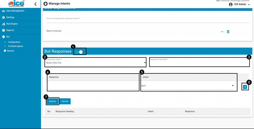 - Click on Submit to add the responses and intent. To reset the values, click on Cancel.
