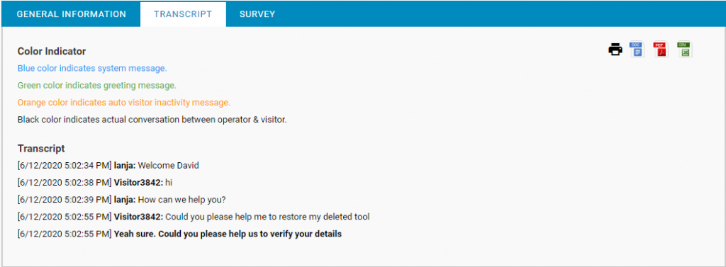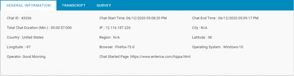 The Survey tab will display the survey details that would have taken place during the time of chat between visitor and supervisor.