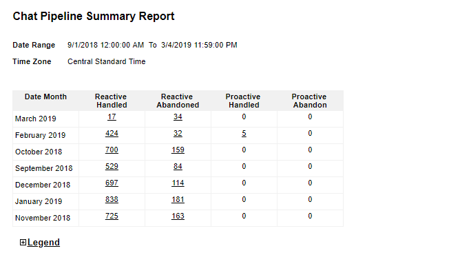 The monthly number of reactive and proactive chats handled or abandoned can be easily known and compared using the Chat Pipeline Summary Report.