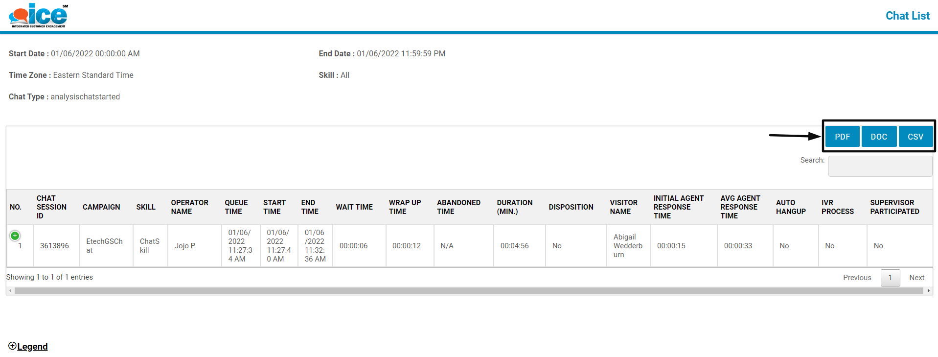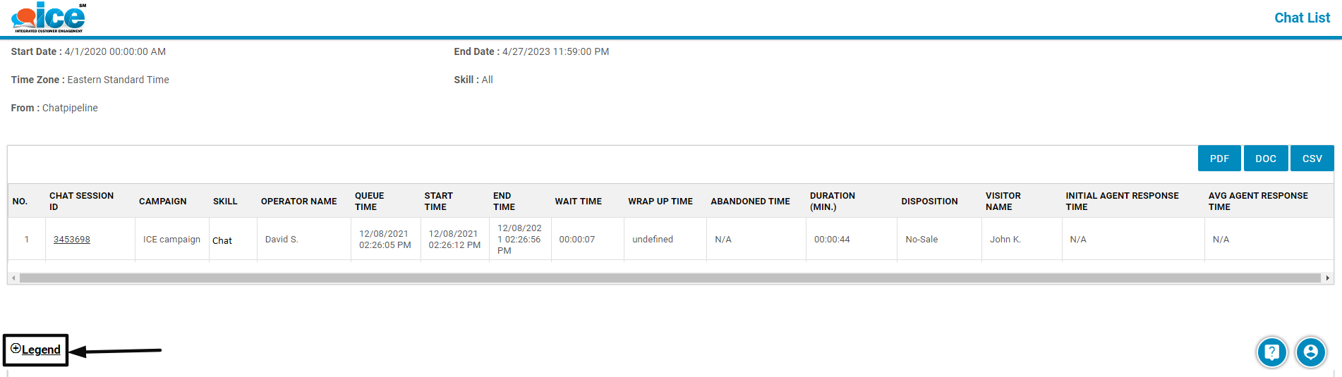 The admin and the supervisor with admin rights can also export the Chat List Report in PDF, DOC, and in CSV formats.