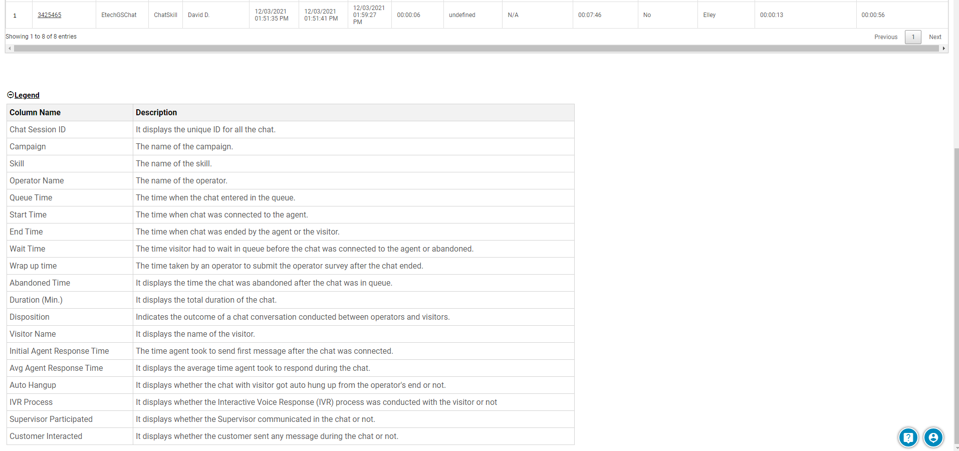 - Wrap Time: This column displays the time taken by the operators to fill in the operator survey and dispose the chat after the chat was ended.