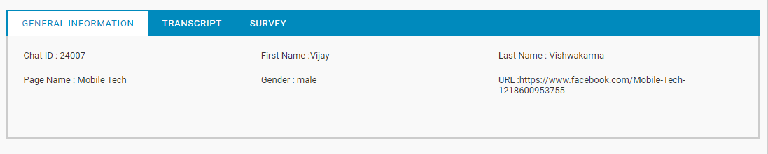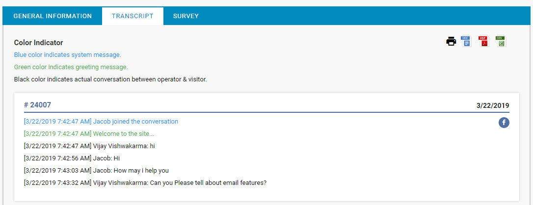 The above report displays the transcript for the chat connected through Facebook. Note the Facebook icon on the right. Similarly, the below report displays the transcript of the chat connected through SMS-