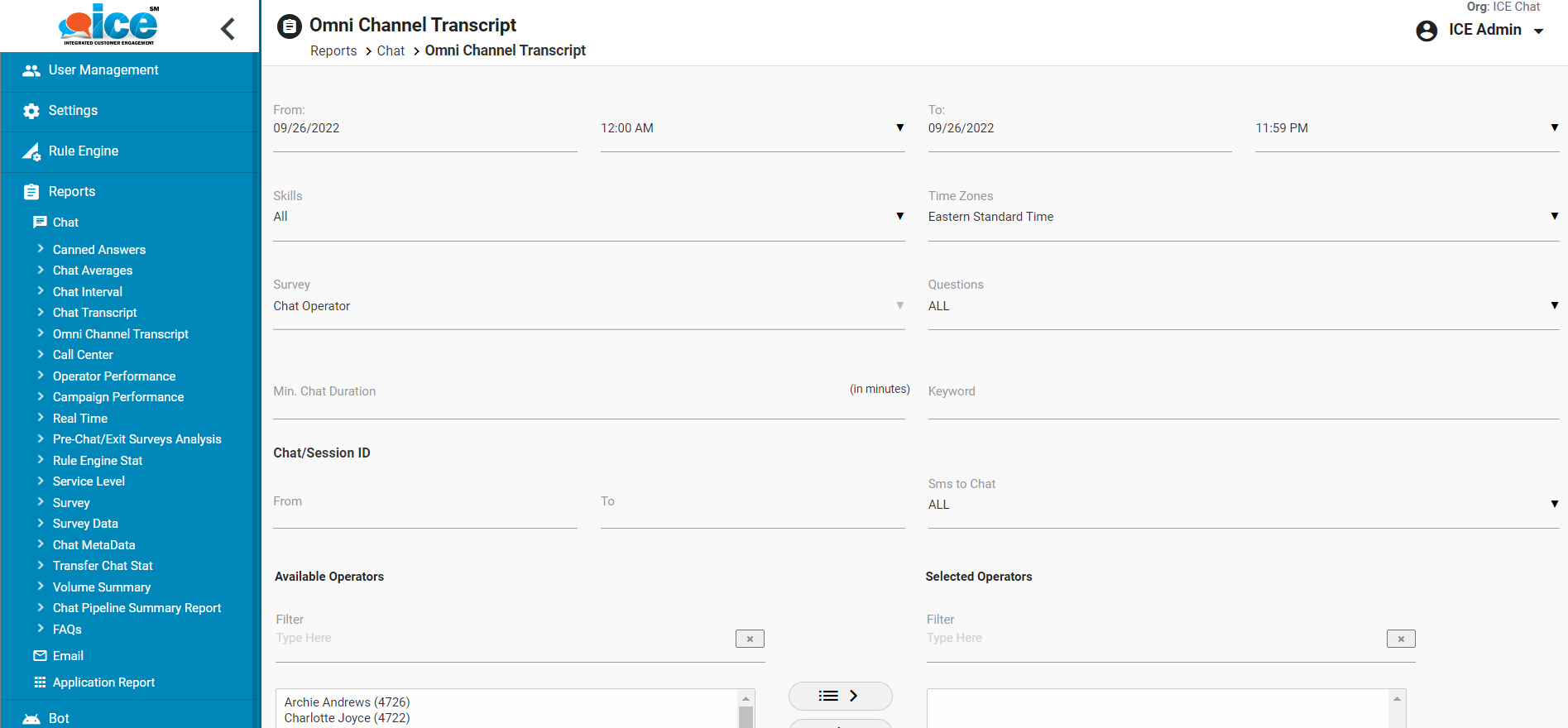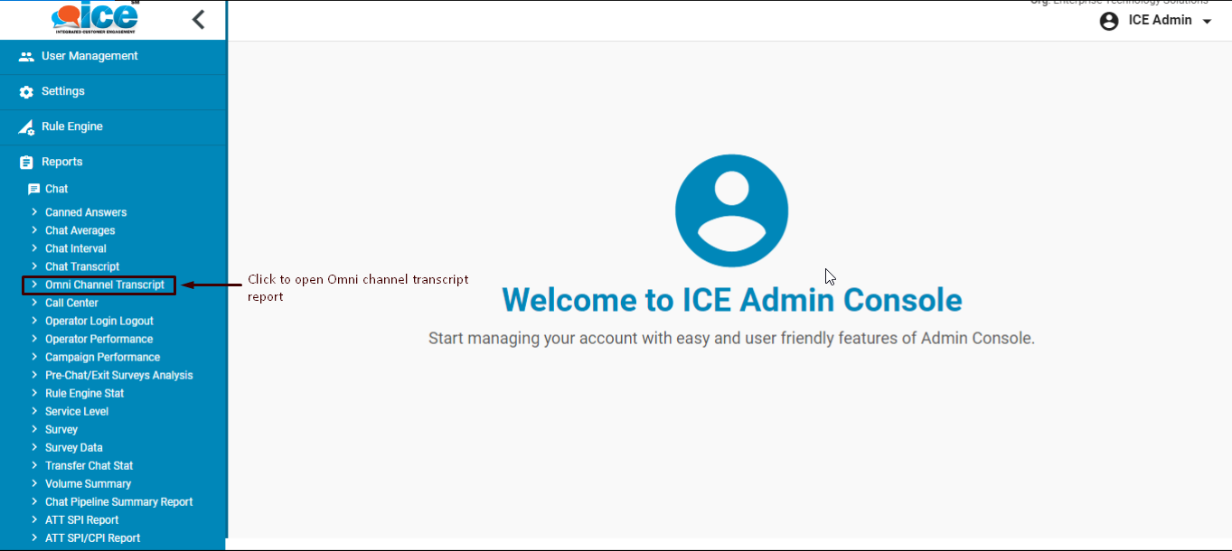 The chat details, transcripts, and survey responses for the chats initiated from different omni channels integrated with the ICE application can be sourced using the omni channel.