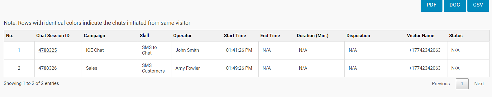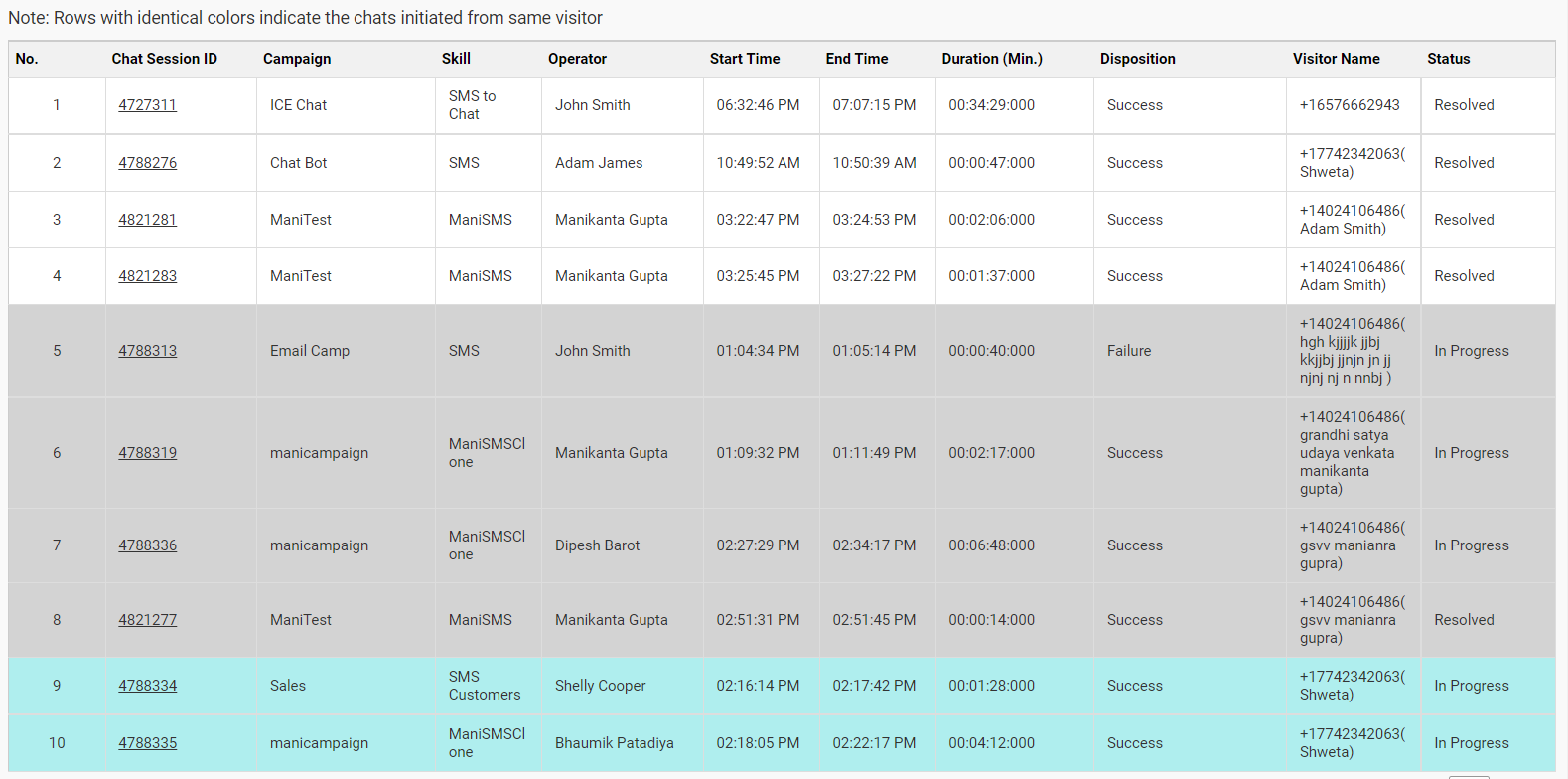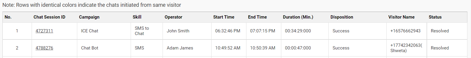 Also, the report grid includes IDs of identical colors that display the chat being initiated by the same visitor. This is as shown below-