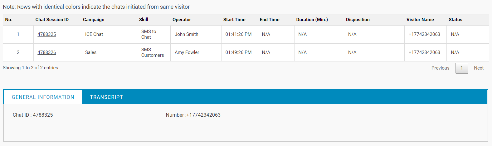 • The General Information, Transcript, and Survey will remain the same as existing for the Chat session IDs associated with Chats received through SMS.
