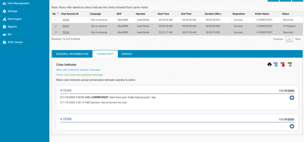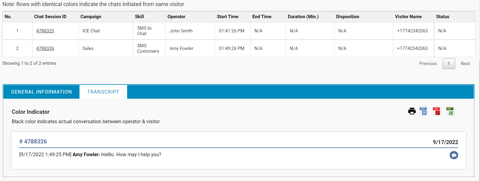 While the Transcript tab will have the following details: Color Indicator for Black, Chat ID, Chat Date in MM/DD/YYYY format, the time stamp for the SMS, Operator Name and Message, Message icon, and Standard Export buttons. This is as shown below: