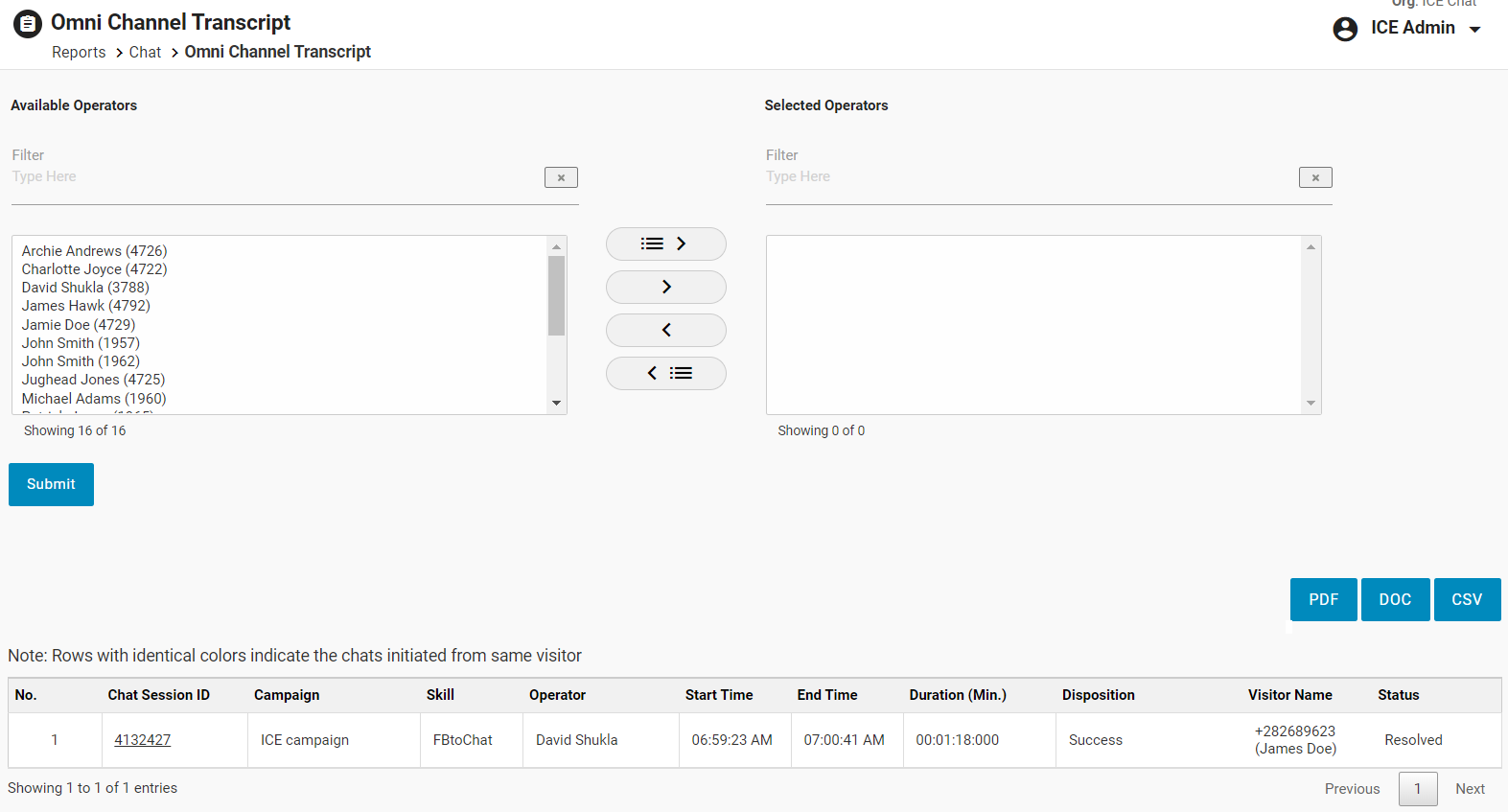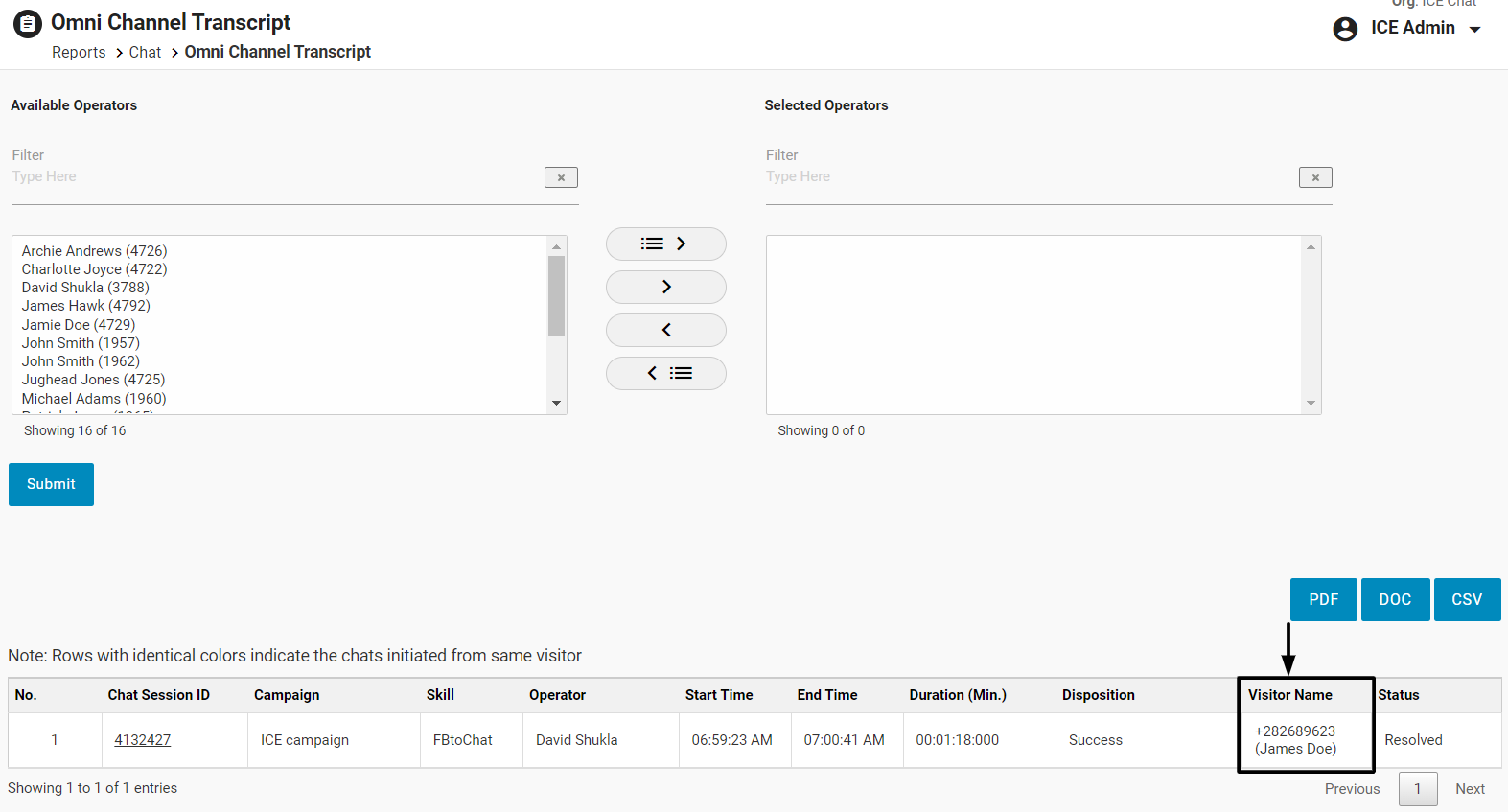 Note: If the visitor’s number is not saved, then on the Omni Channel Transcript Report, the Visitor Name column will only display the visitor’s number.