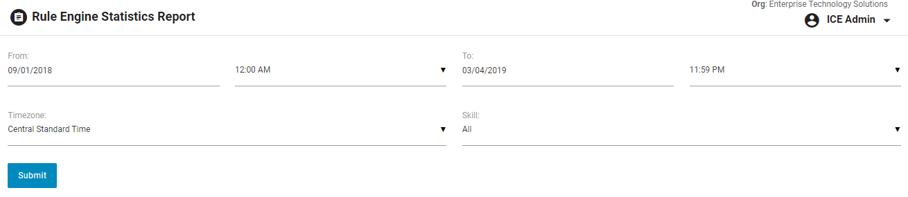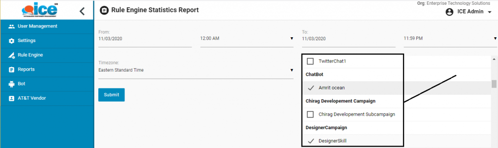 To view rule engine reports go to Reports > Chat > Rule engine stats and the following screen will be redirected to the user-
