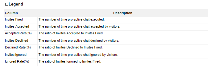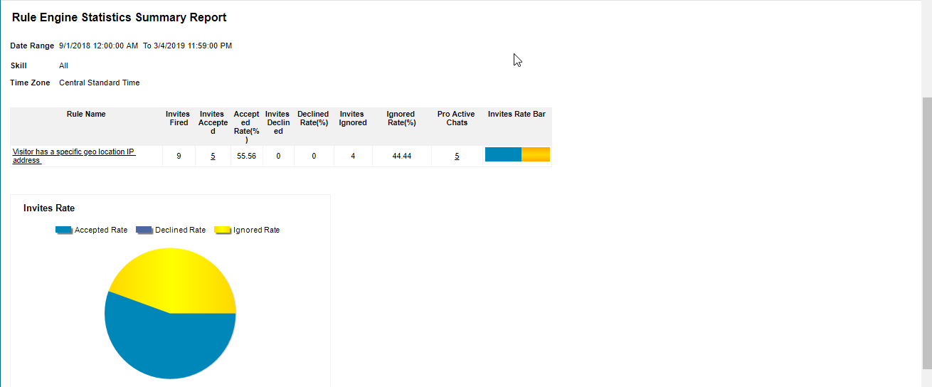 This is a sub-report that is accessible through the main Rule Engine Stats Report, by clicking on the data values displayed under the Invites Accepted and Proactive Chats columns.