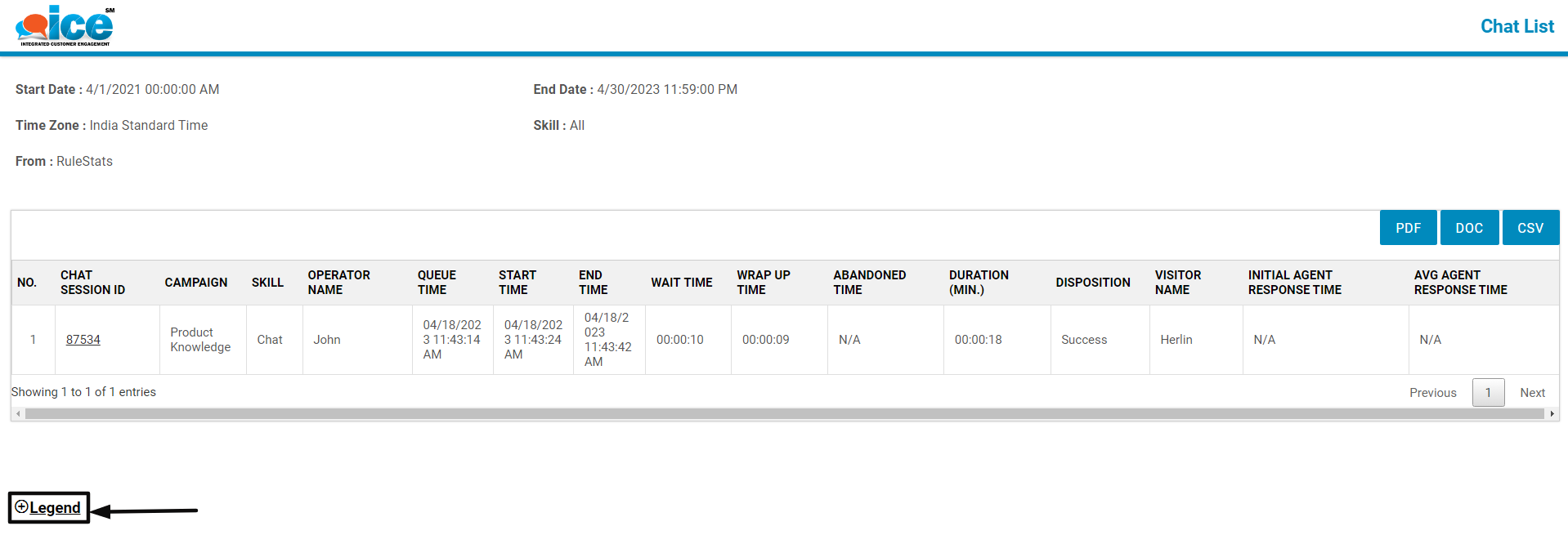From the main Rule Engine Stats Report, the admin and the supervisor with admin rights can access the Chat List Report. They can access the data of the chat interaction that occurred between the agents and the visitors on the Chat List Report.