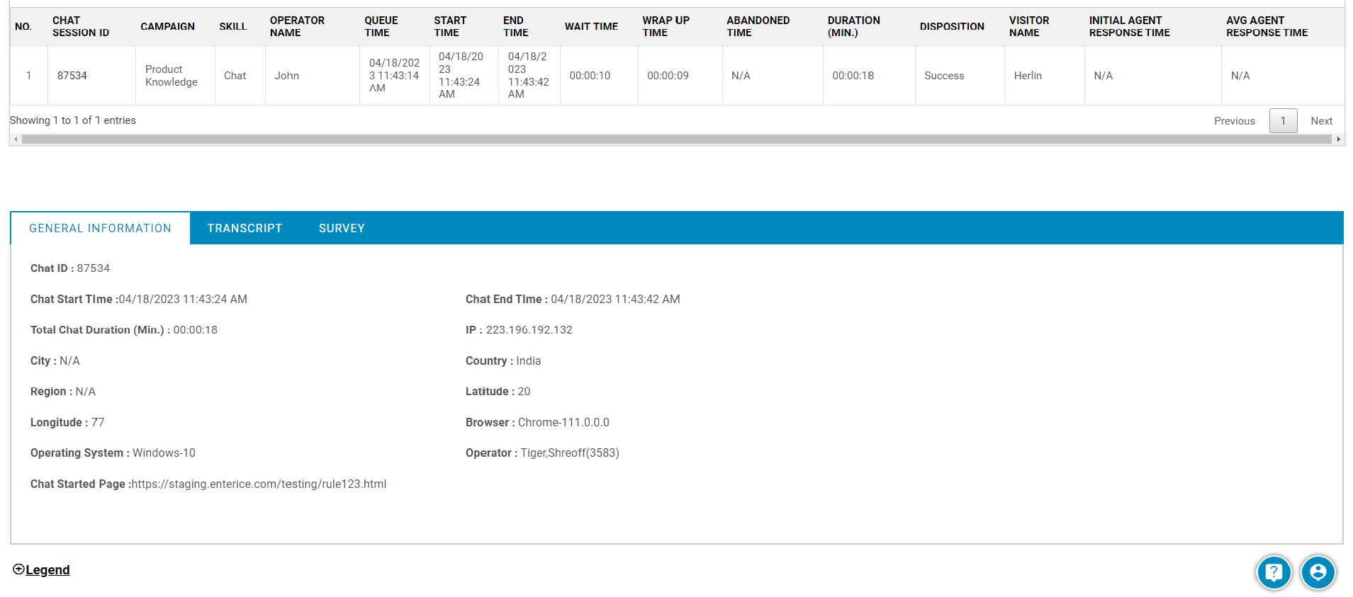 - Chat Session ID: The Chat Session ID will be displayed. The ID will be clickable. When clicked on the ID, General Information, Transcript, and Survey tabs will be displayed as shown below: