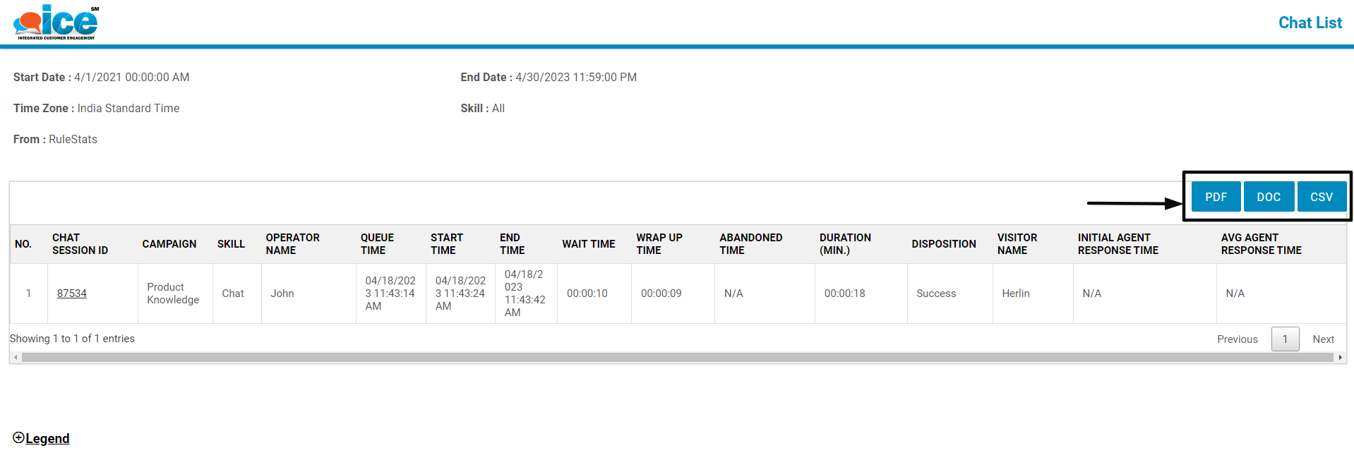The admin and the supervisor with admin rights can also export the Chat List Report in PDF, DOC, and in CSV formats.