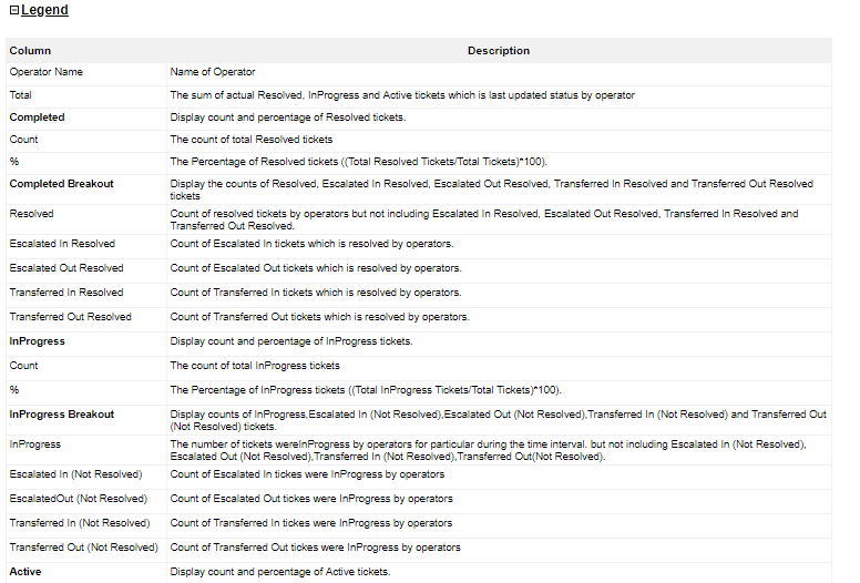 This report gives a complete breakdown of tickets resolved, In-Progress and Active including escalations and transfers based on operators and selected date range.