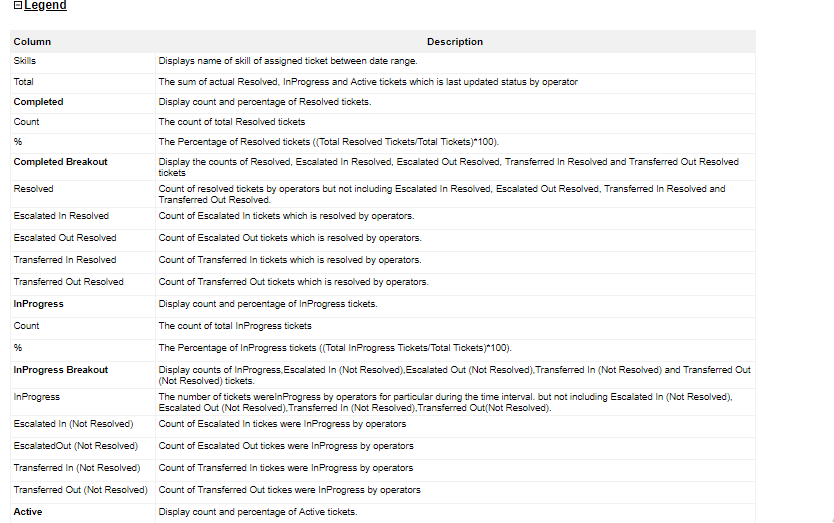 This report gives a complete breakdown of tickets resolved, In-Progress and Active including escalations and transfers based on skills.