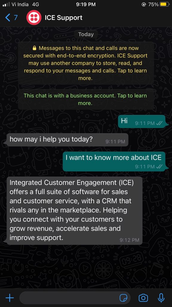 The WhatsApp Bot will be live on the configured WhatsApp account in the campaign and visitors can communicate with it as highlighted in the image below: