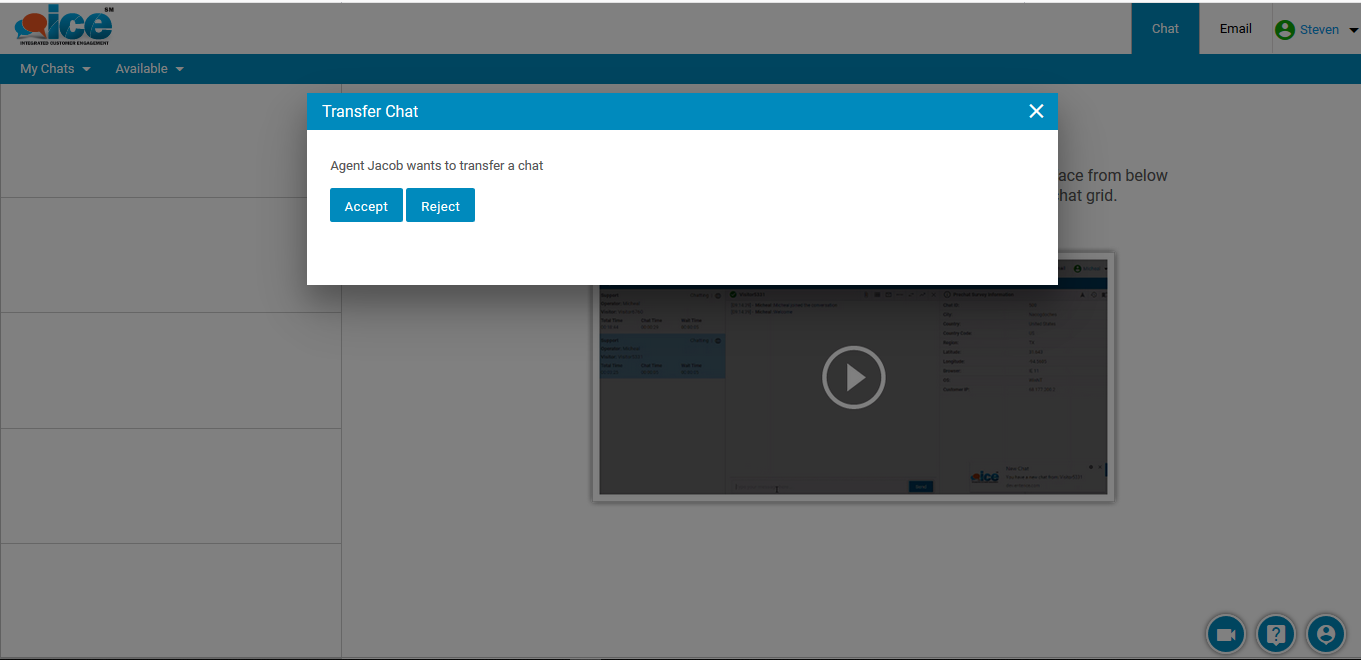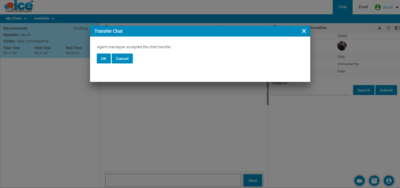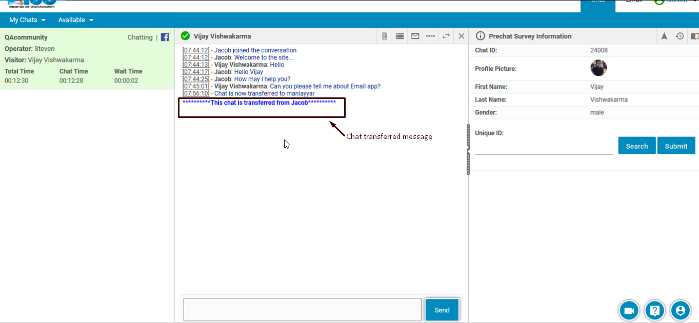 When the other agent accepts the request of transferred chat the current agent will receive a notification on his/her console like the one as shown below-