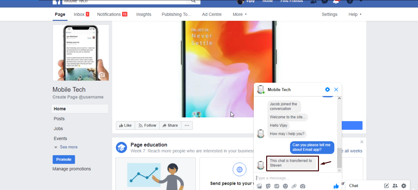 An ICE chat agent can transfer a chat to other agent while connected with a visitor through Facebook.