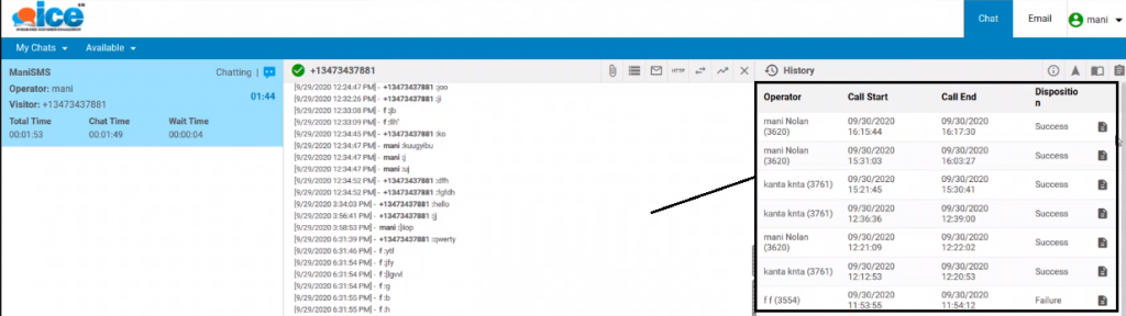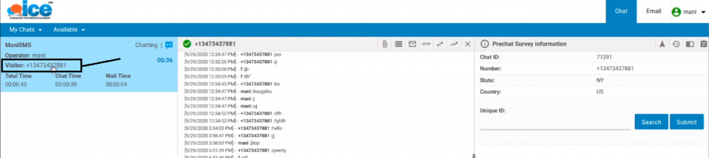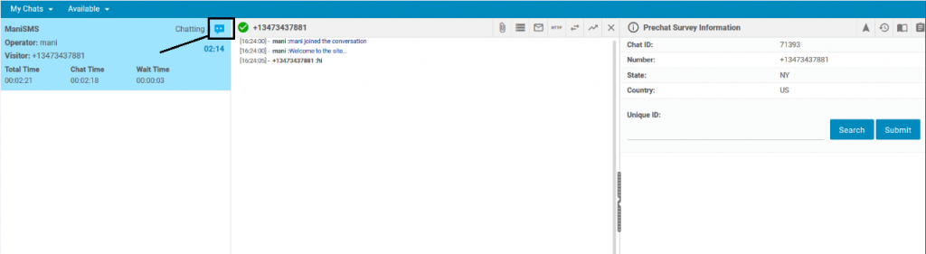 Once saved, the visitor can initiate the chat with an agent through SMS. However, this will be a normal chat scenario for the agent. In this situation, an agent will be able to view a chat through the SMS icon on his/her console as shown below: