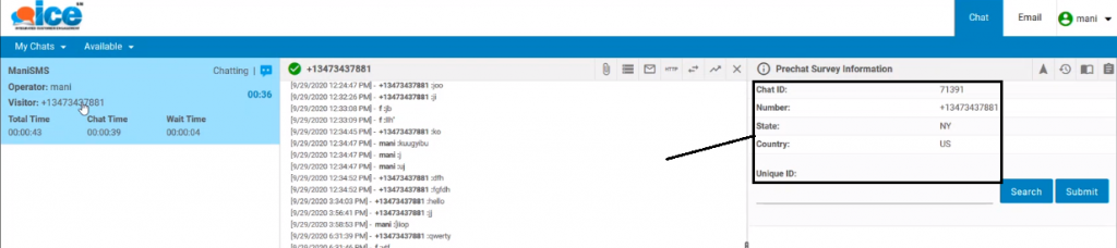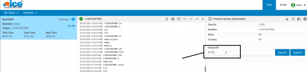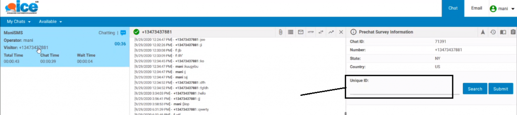 An agent can view previous chat records of the existing connected visitor by entering a unique ID in the respective field.
