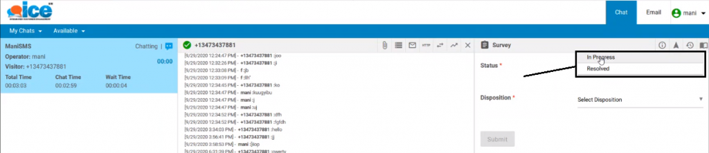 An agent can select In-Progress when a visitor’s concern about chat connectivity is not entirely completed. Similarly, an agent can select Resolved when the chat with the visitor is completed.