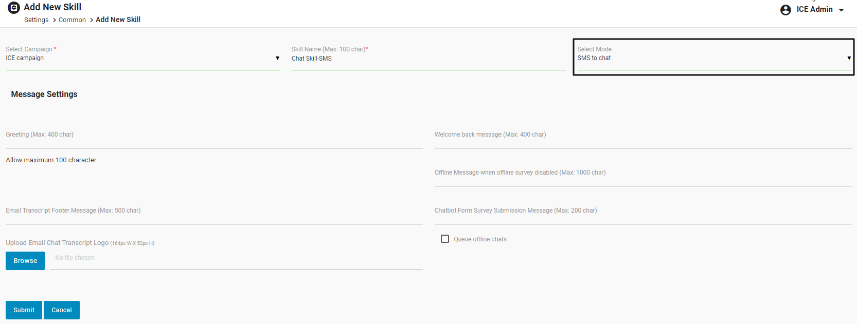 Skill: Select the skill from the dropdown list which is created specifically for the SMS to chat mode.