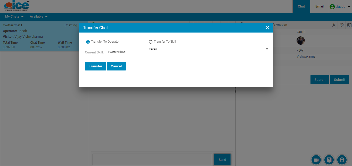 During a chat an agent can transfer a chat using icon. The system would generate a window wherein agent 1 can check for available operators or skills to transfer the chat. This is as shown below-
