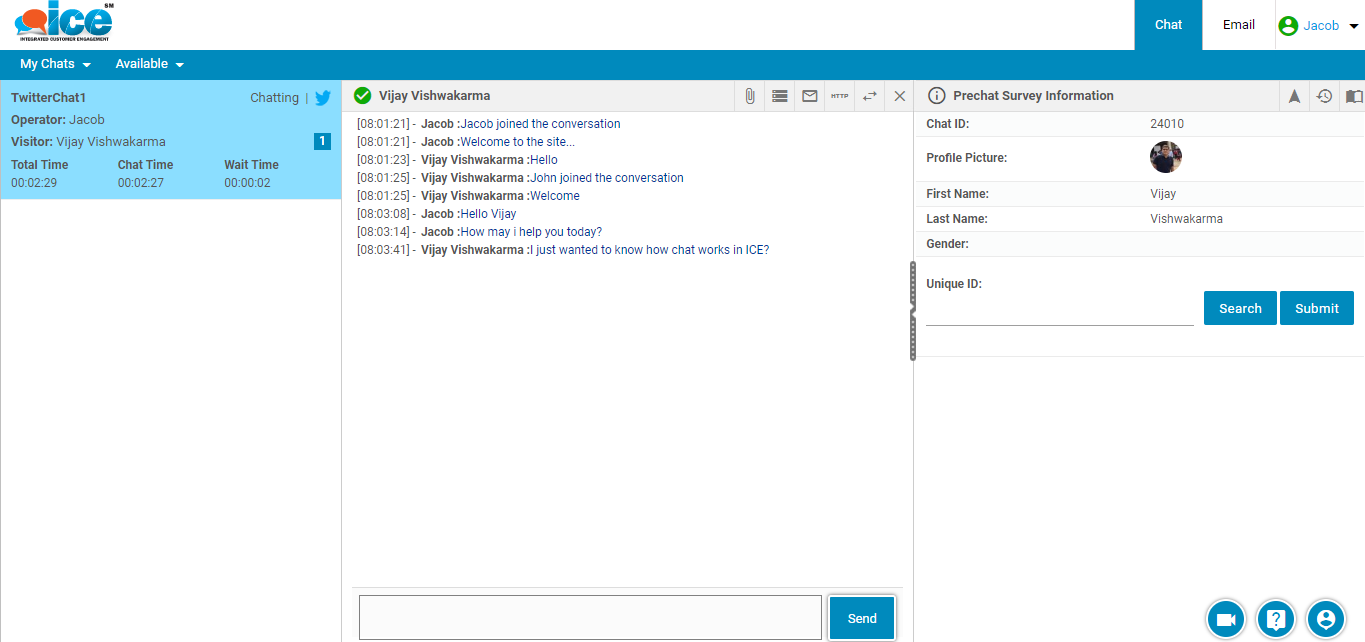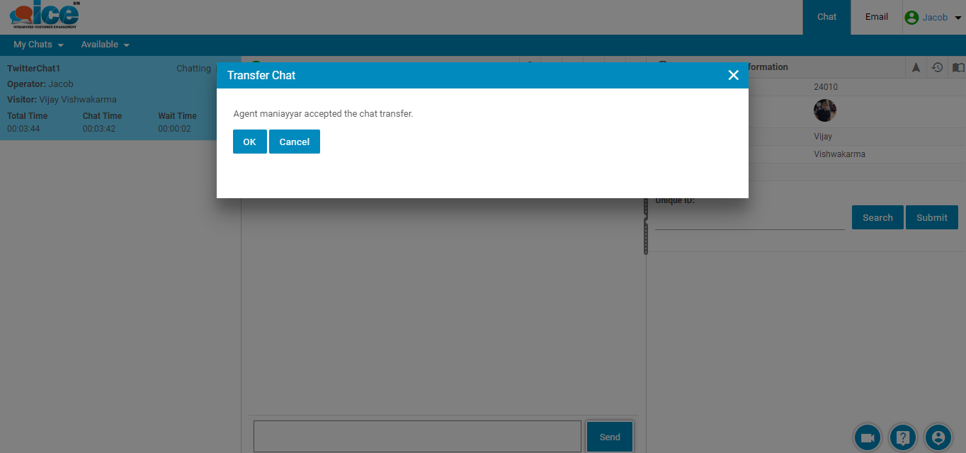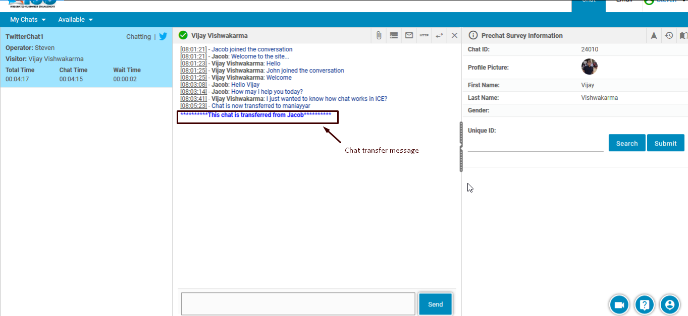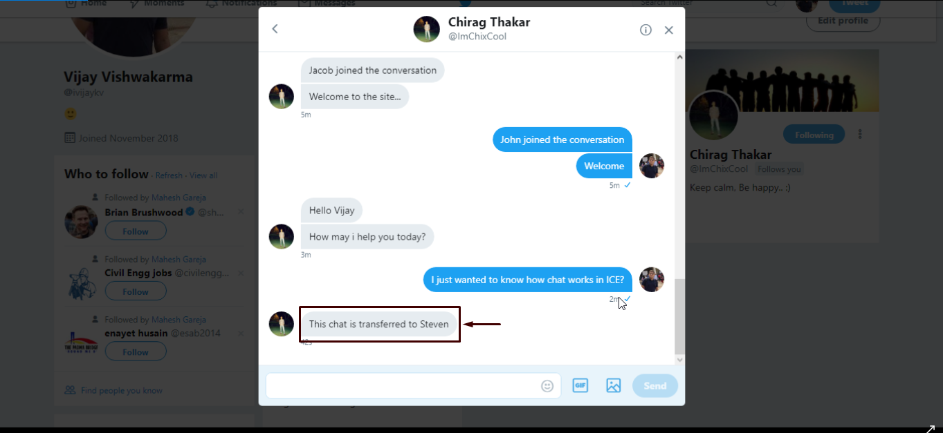 An ICE chat agent could transfer the chat of a visitor connected through Twitter to another agent.