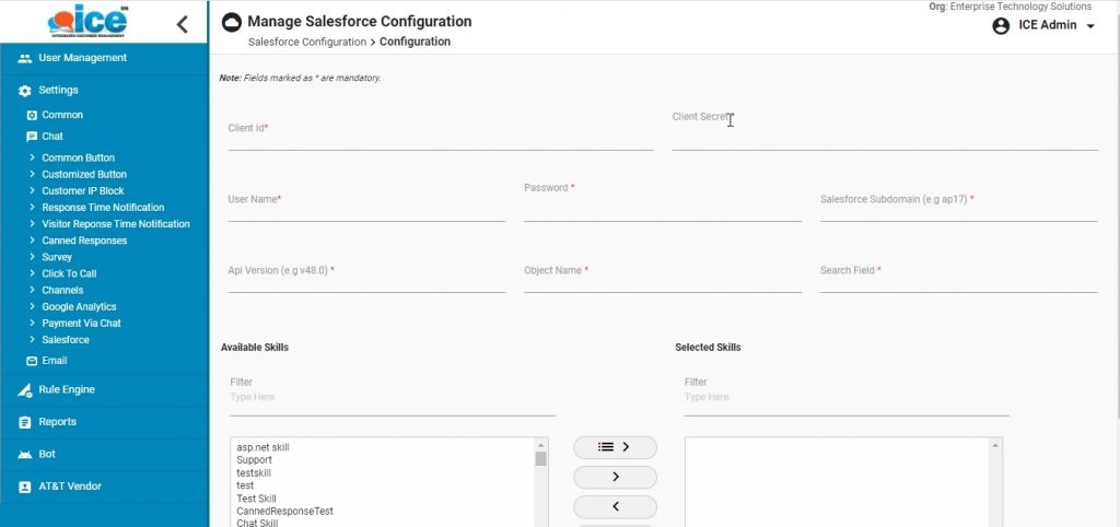 To configure Salesforce integration from admin panel, go to Common>Chat>Salesforce. The system displays the following console-