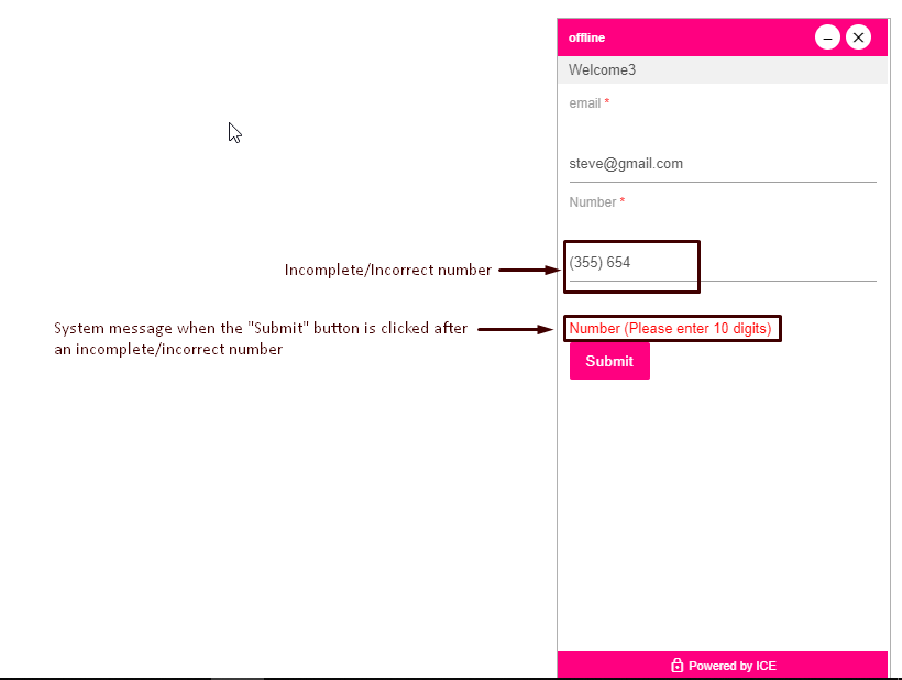 Further. if a user enters an incorrect or incomplete number in phone number field and clicks Submit button, the system will generate a message as shown below-