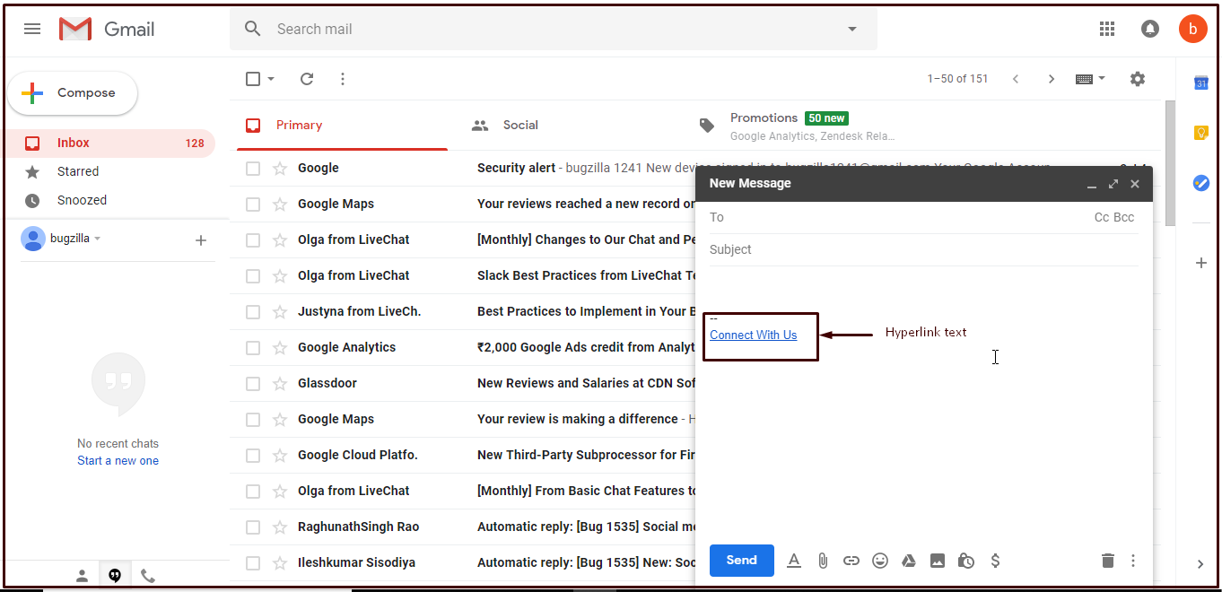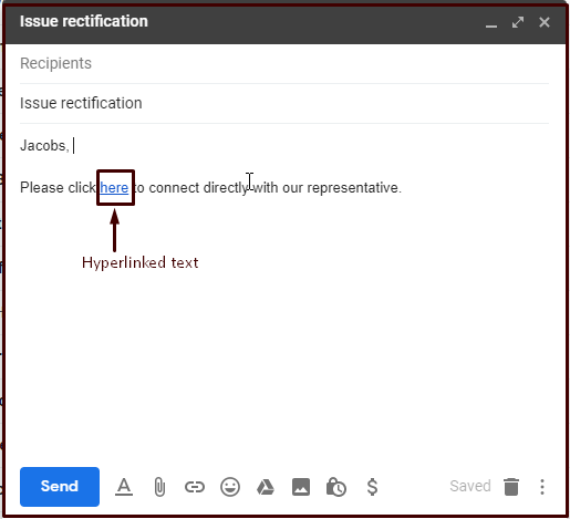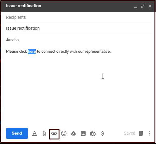 - Select desired text(s) from the mail body to be hyperlinked and click on the link icon as shown in the screen-