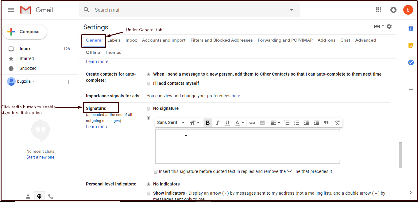 - Scroll down for more fields to reach signature option under General tab as shown in the below screen-