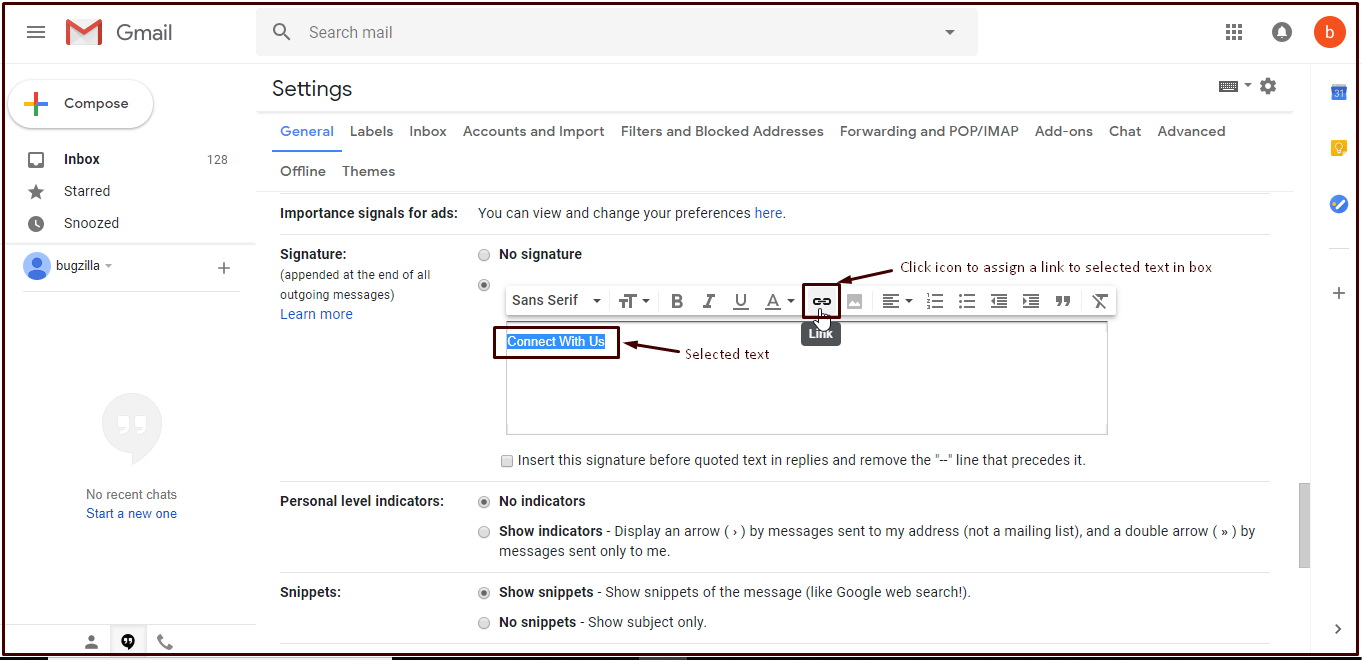 - Type a desired text in the text field and then select it. Further, click on the link icon on the tool bar to provide a link to the selected text. This is as shown below-