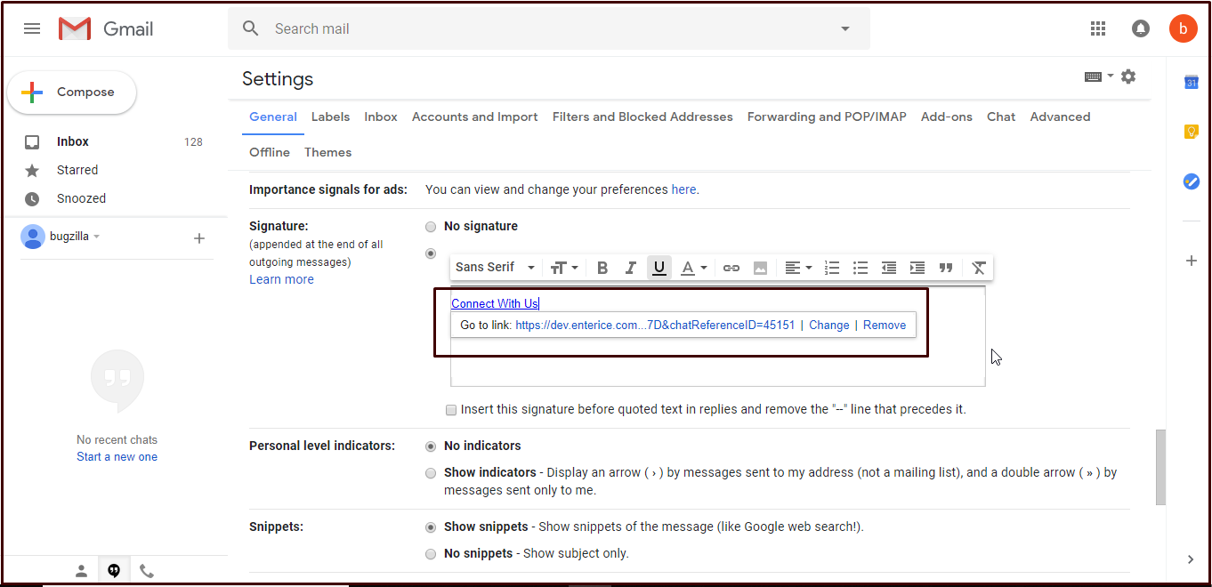- Click Save Changes after making the changes. While composing a mail, the hyperlinked text will be displayed as a signature like the one as shown below-