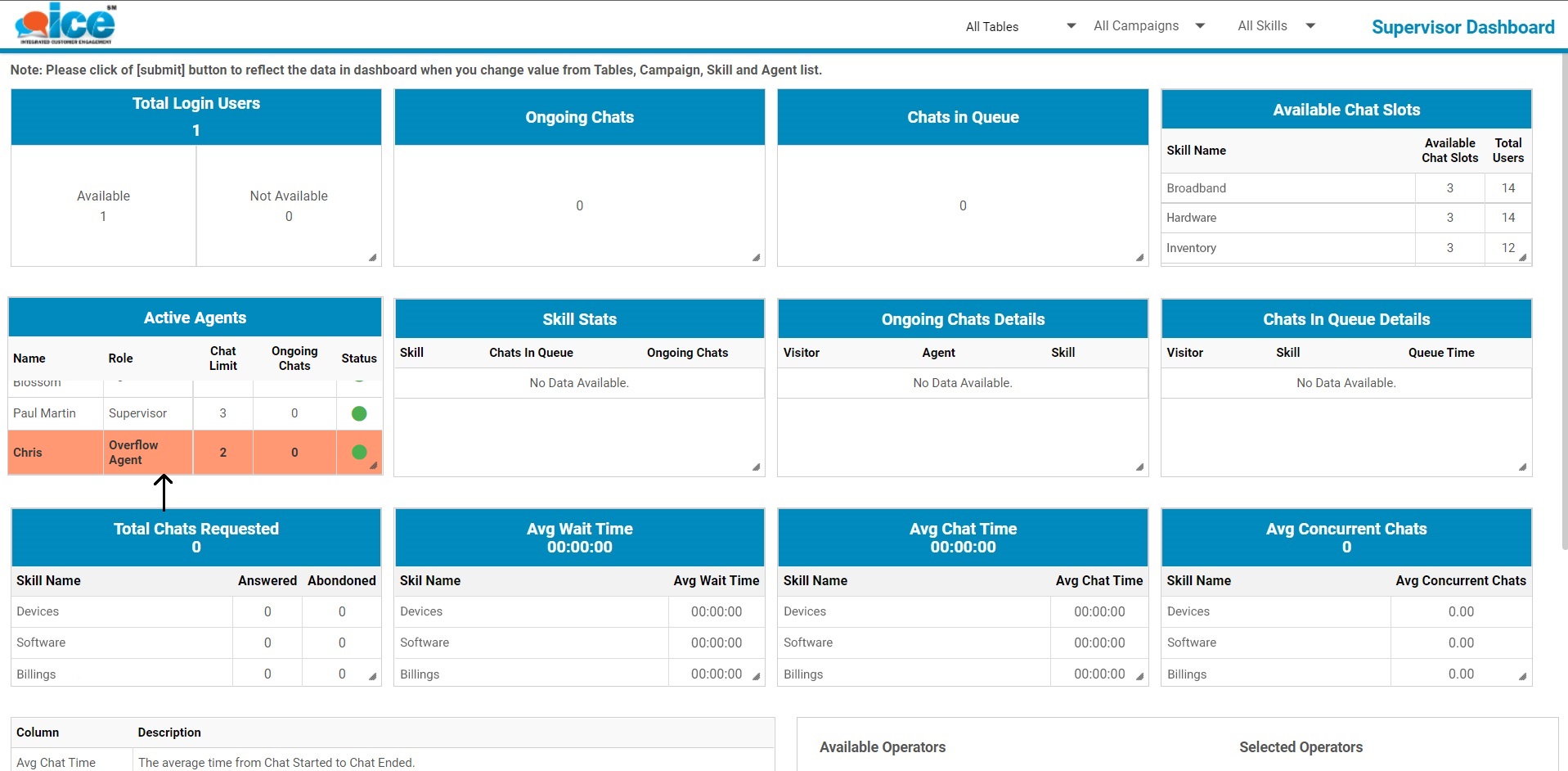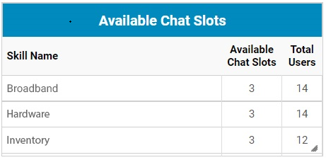 - The Available Chat Slots table in the Supervisor Dashboard will only display the total number of available chat slots assigned to the agents and supervisors for respective skills. The available chat slots of overflow agents will not be taken into consideration here.