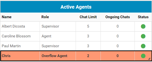 - Under the Active Agents table, the overflow agent will always be displayed in the highlighted format as shown below.