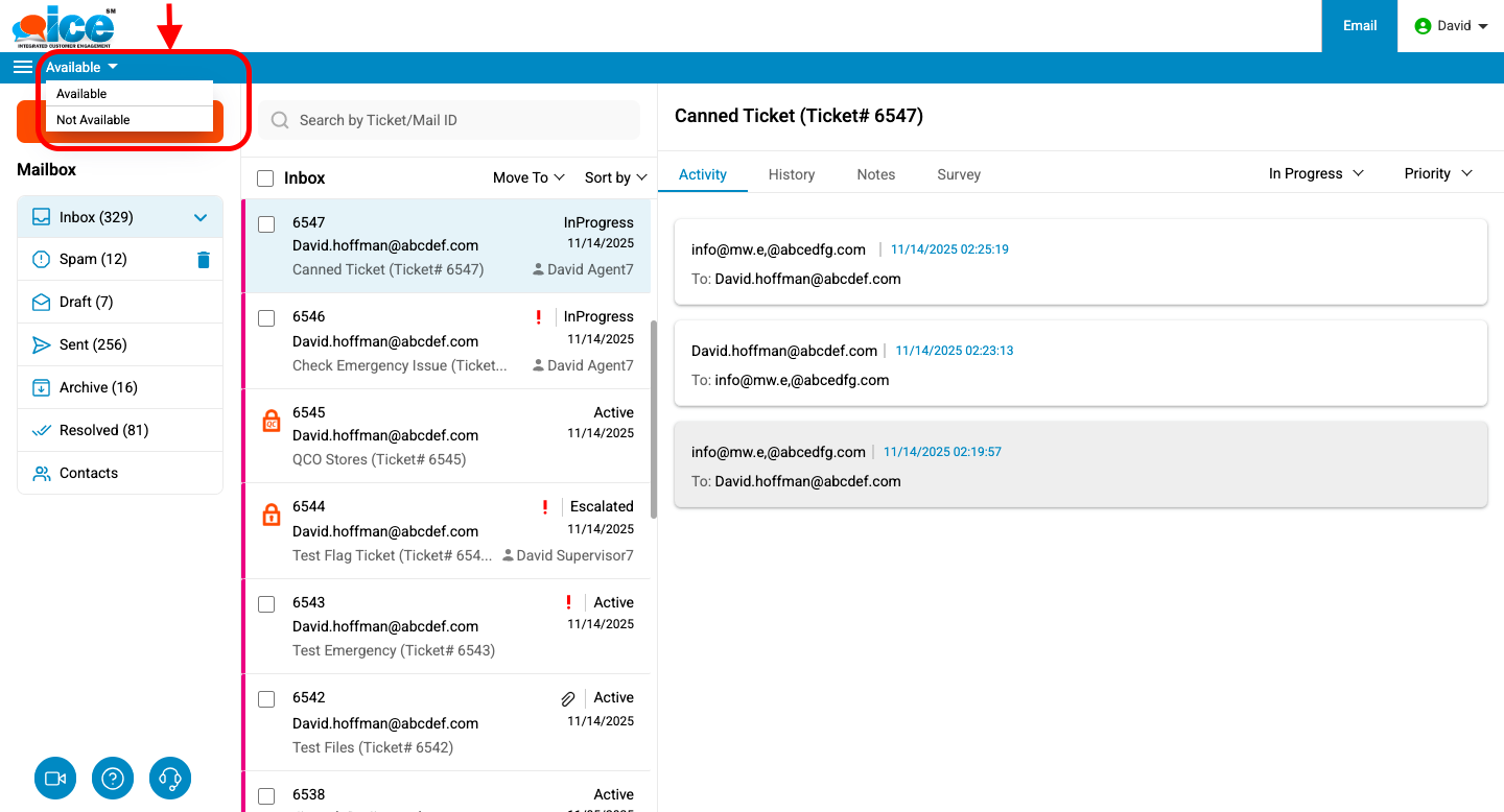 The operator will continue receiving tickets from other agent or supervisor when the status is set to Available. No tickets will be received if the status is set to Not Available. Further, default status of an operator can be selected from Profile.