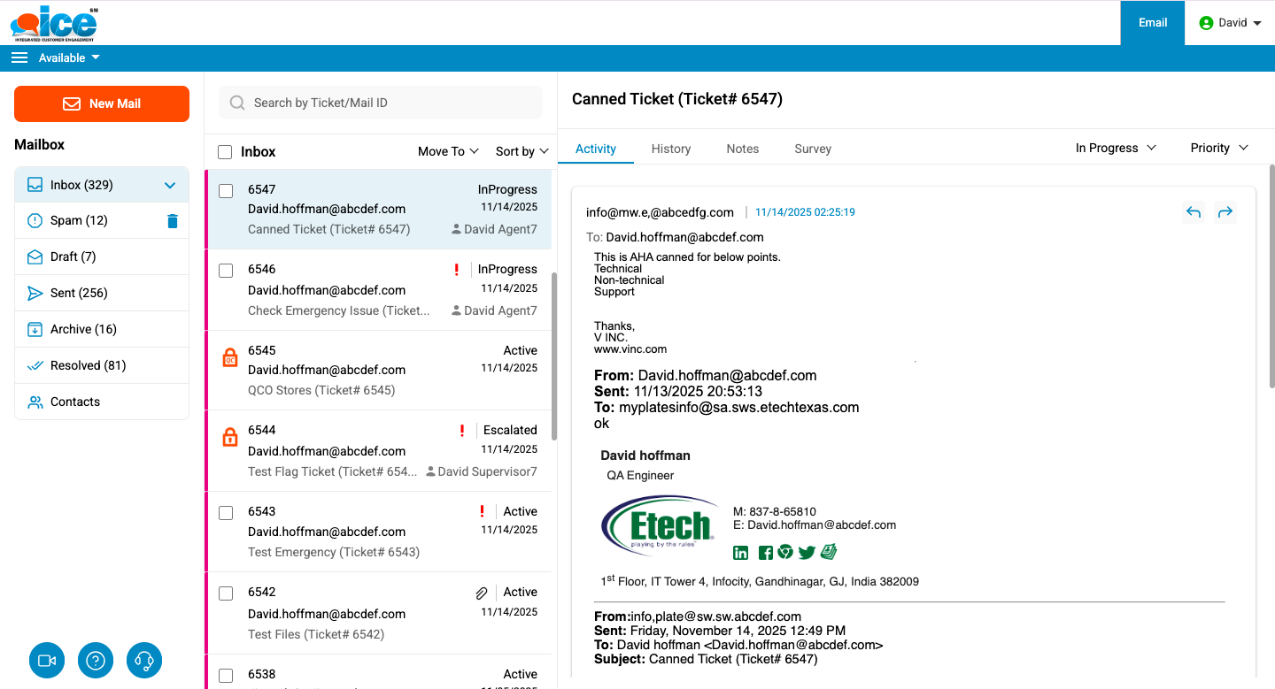7. Editor Section- It allows an email operator to reply or forward a ticket to the customer who has raised a ticket. Also, it provides options like Canned Responses, Attach File, Escalate and Save as Draft along with information section such as activity, details, history, notes, and survey. This is as shown below-
