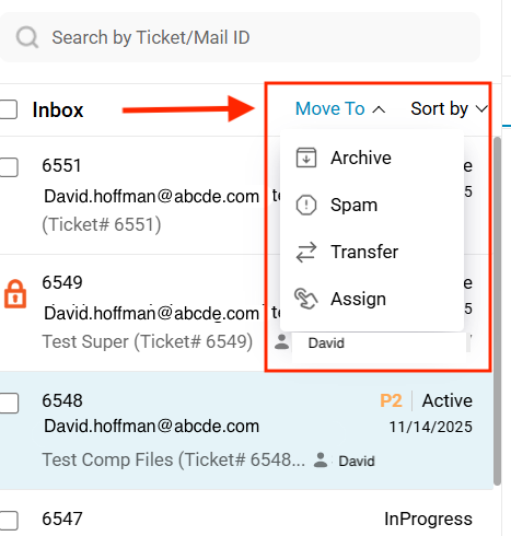 The list of buttons includes Archive, Spam, Transfer, and Assign options. Above the Move To dropdown, a Search text bar is available to help you search for a ticket.