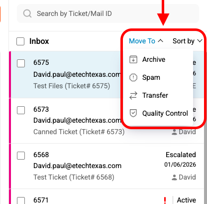 - Select the ticket by clicking its checkbox, then click the Move To button followed by the Transfer