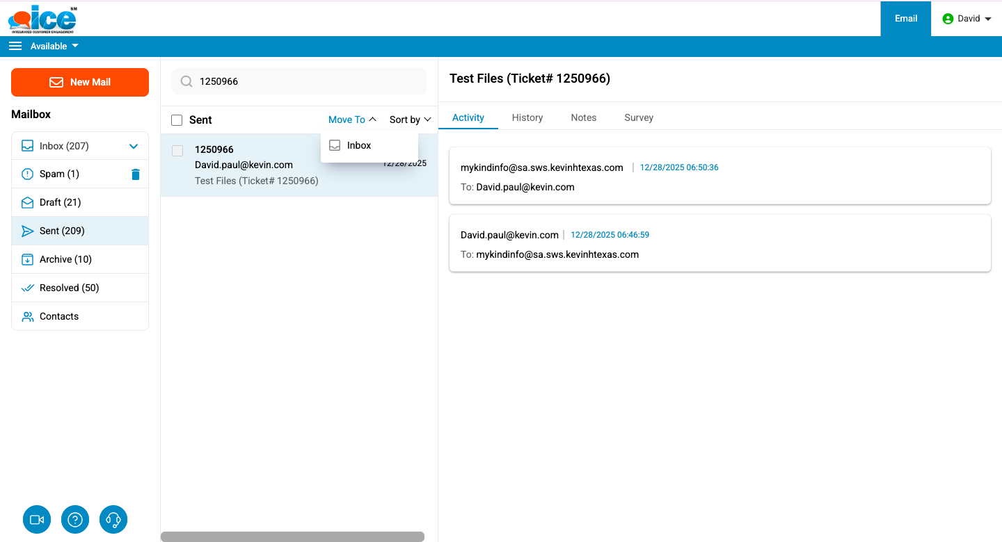 ICE Agents can move one, multiple, or all the emails from their sent folder to their Inbox folder in the ICE Email.
