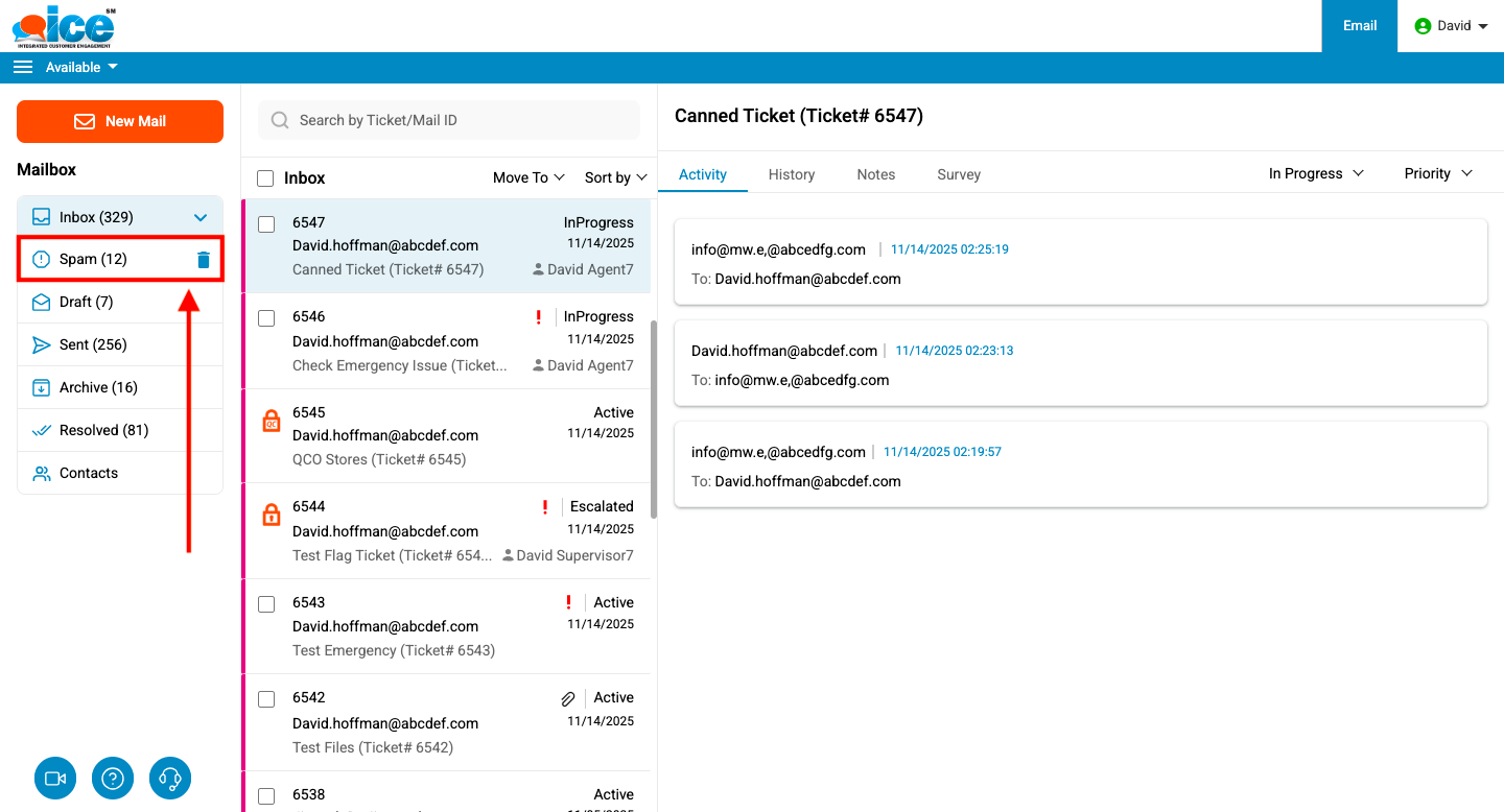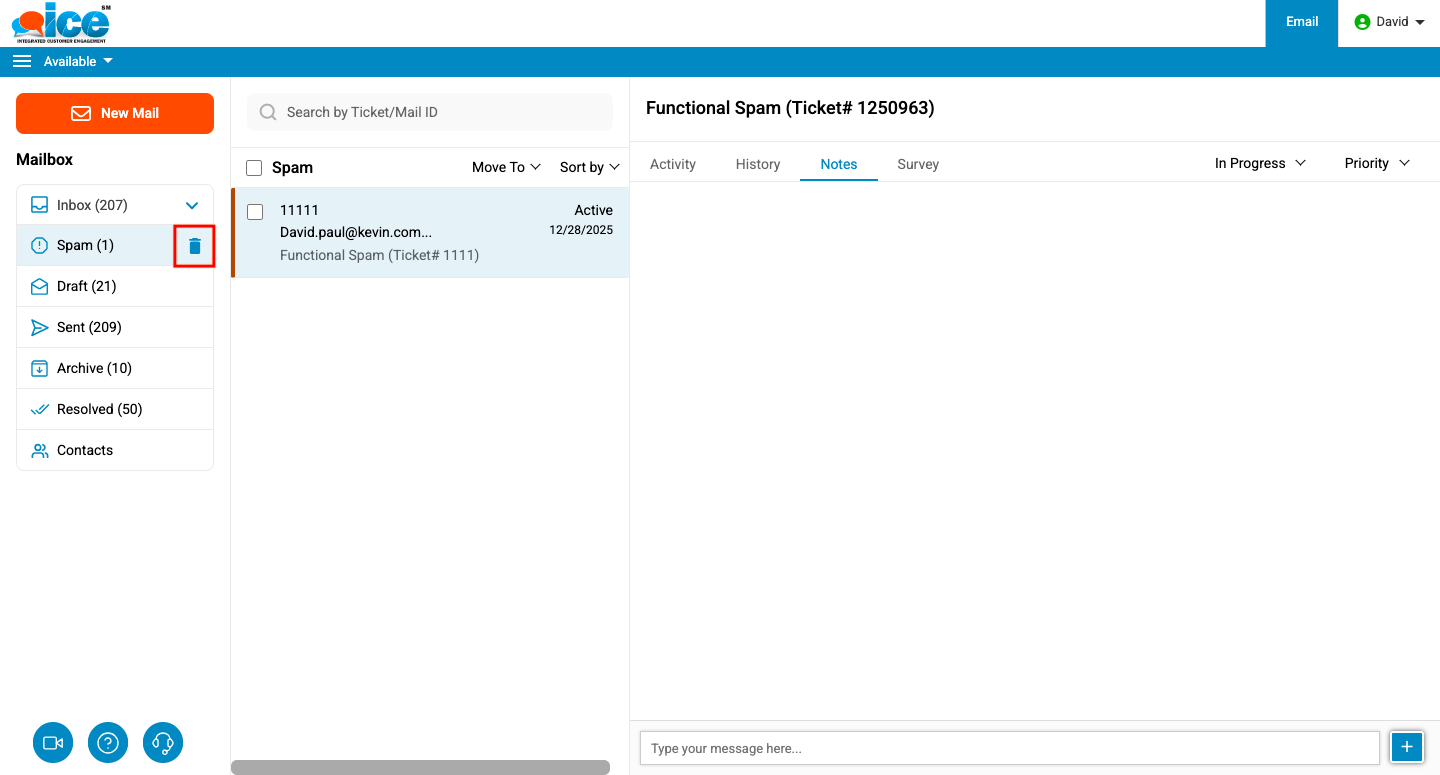 Note: When deleting tickets from the Spam folder, only tickets that are assigned to an agent are soft-deleted. Unassigned tickets are not deleted and will remain in the folder.