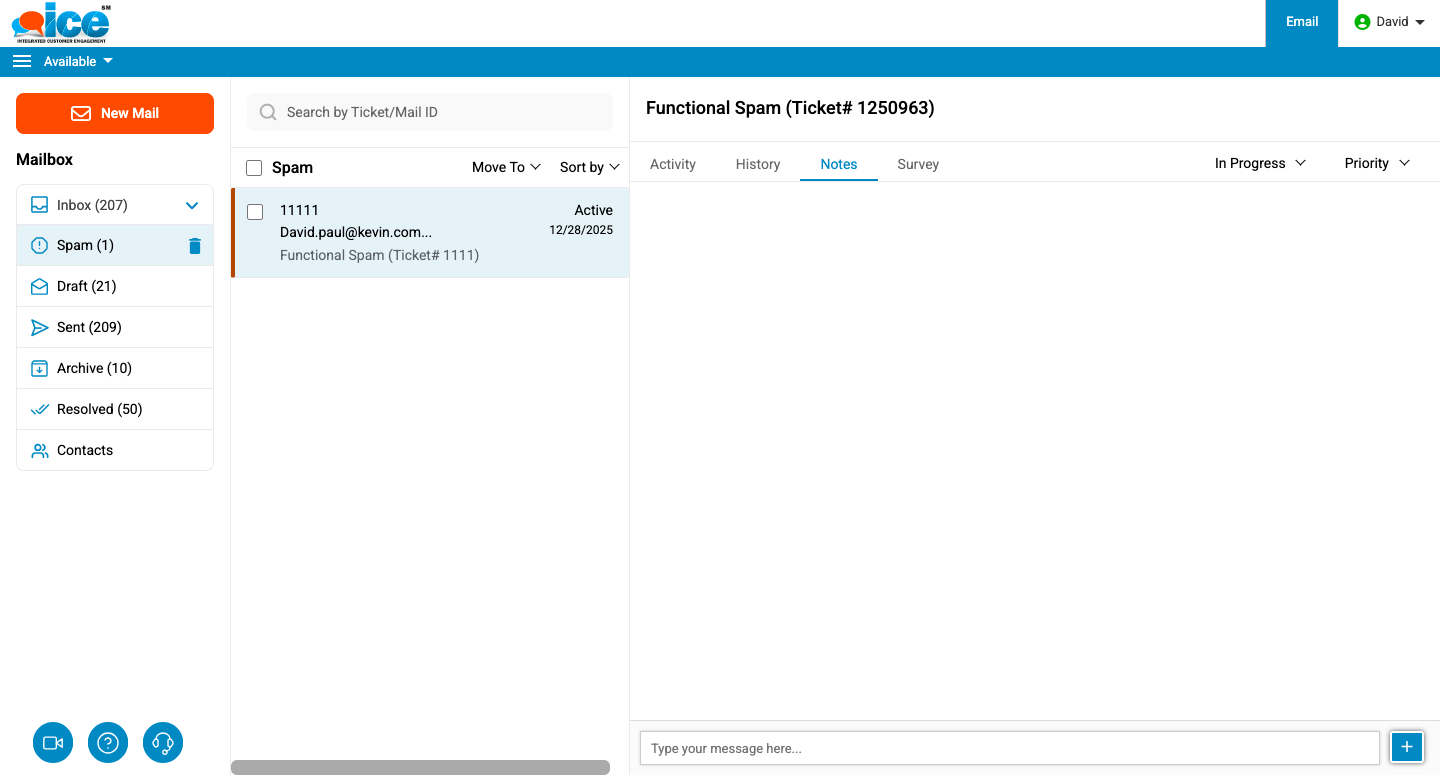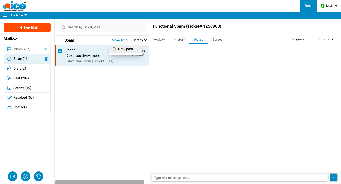 An operator can select any spam email and use the Move To button to take the required action. They can either view the ticket or return it to the Inbox by clicking the Not Spam option available under the Move To button.