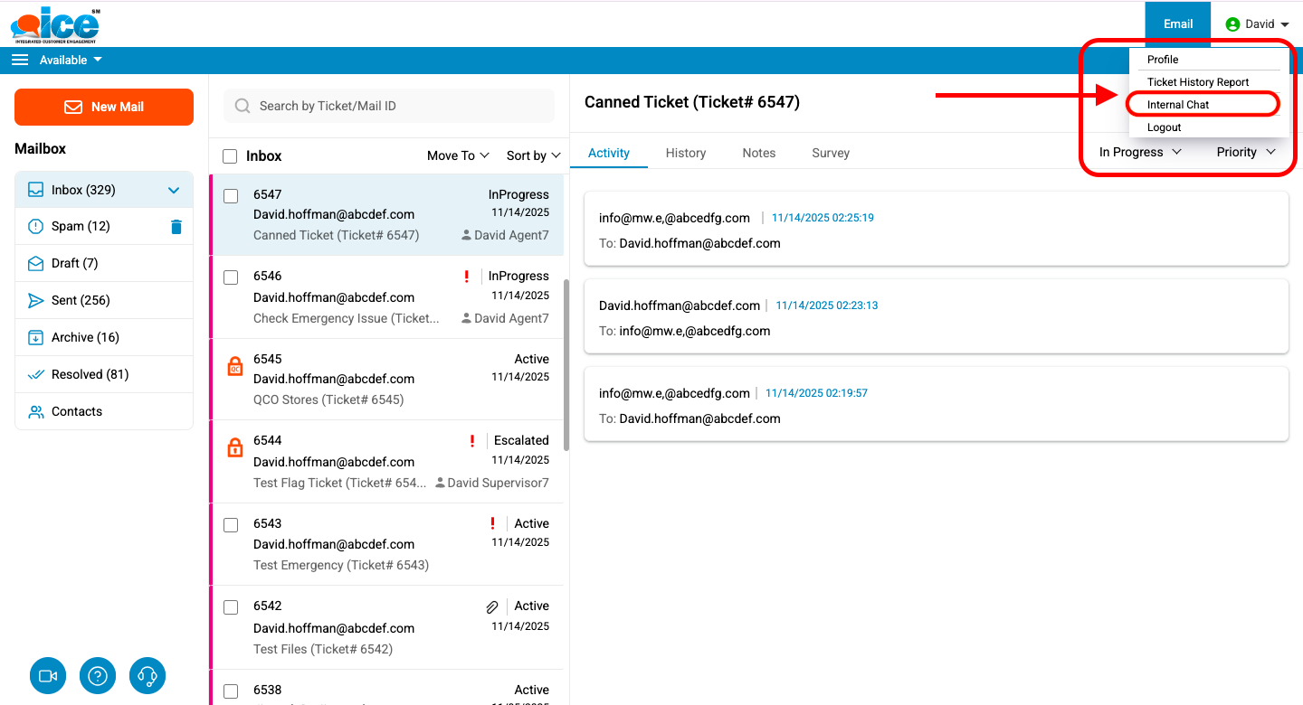 Click Internal Chat button under User account in operator console to interact with other available operators/supervisors as shown in the screen below-