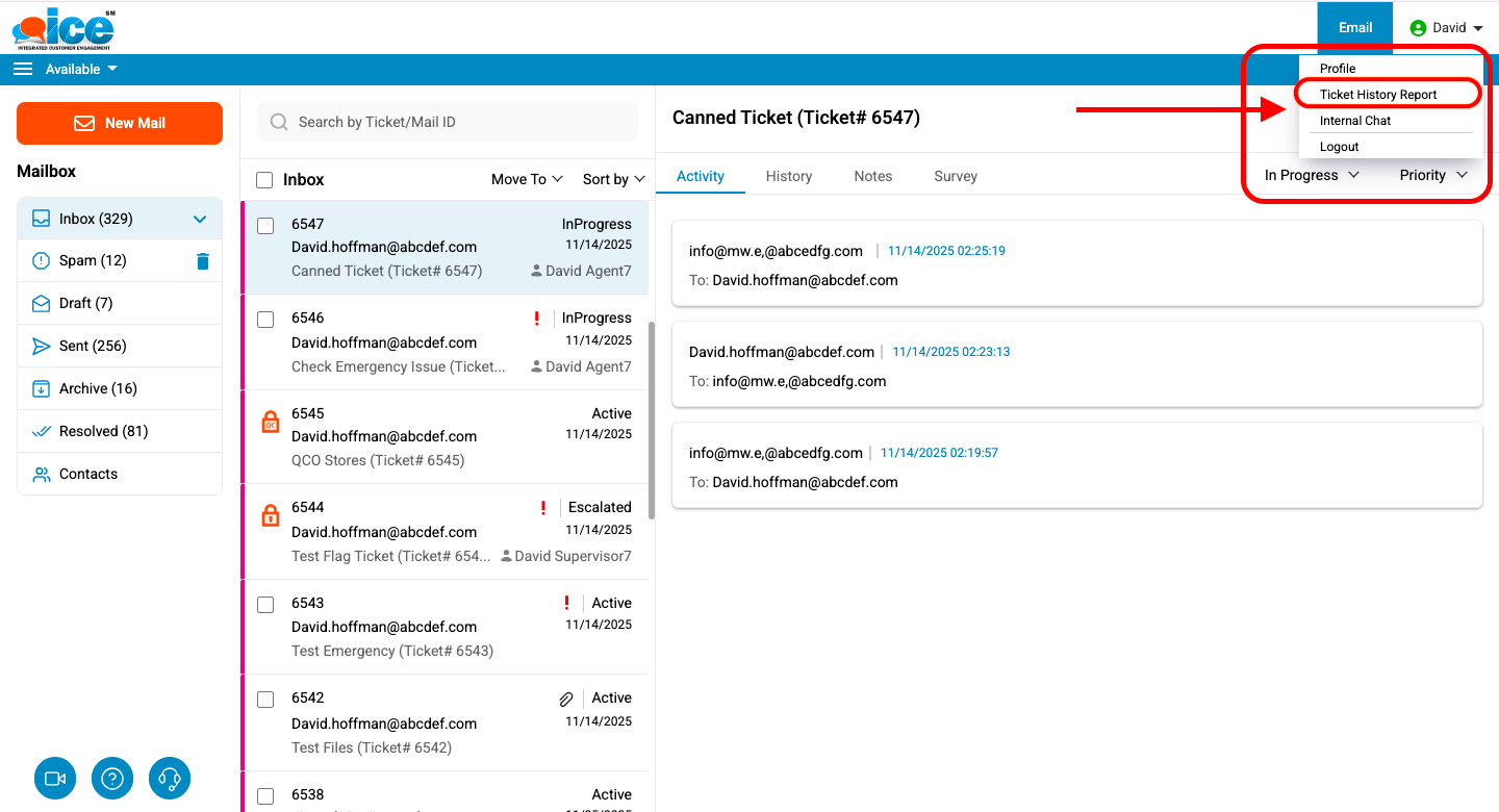 Click Ticket History Report button under user account to view the Chat history report as shown highlighted in the below screen-