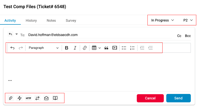 icon to attach files to the ticket. A dialog box appears from where one can select a file and attach it to the ticket. (See Email Attachment)