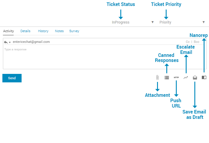 Editor Window is the place where an operator can reply or forward and send ticket to the customer who has raised a ticket. Also it has options like Canned Responses, Attach File, Escalate, Save as Draft and Nanorep.