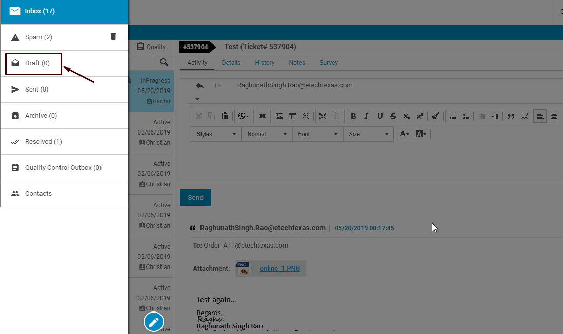 3.Click Draft from the Folder List to view all the tickets that have been saved as a draft as shown highlighted in the below screen-