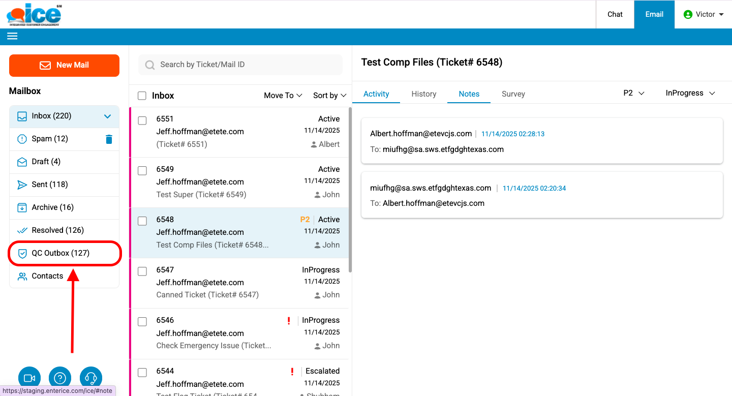 The list displays all the tickets that a supervisor has sent to the Quality Control Outbox folder as well as the tickets that customer has sent containing keywords which are added in the at least one of these keywords field from Quality Control Outbox section of the Admin Console.